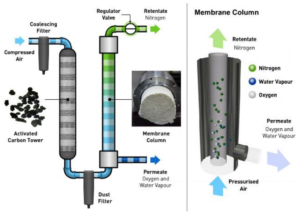 El concepto de la separación del gas mediante membranas de fibra hueca es sencillo. Un tubo hueco de pequeñas dimensiones permite que gases no deseados como el oxigeno y el vapor de agua pasen a través de sus paredes mientras se retiene el nitrógeno para utilizarlo como producto gaseoso en la aplicación.